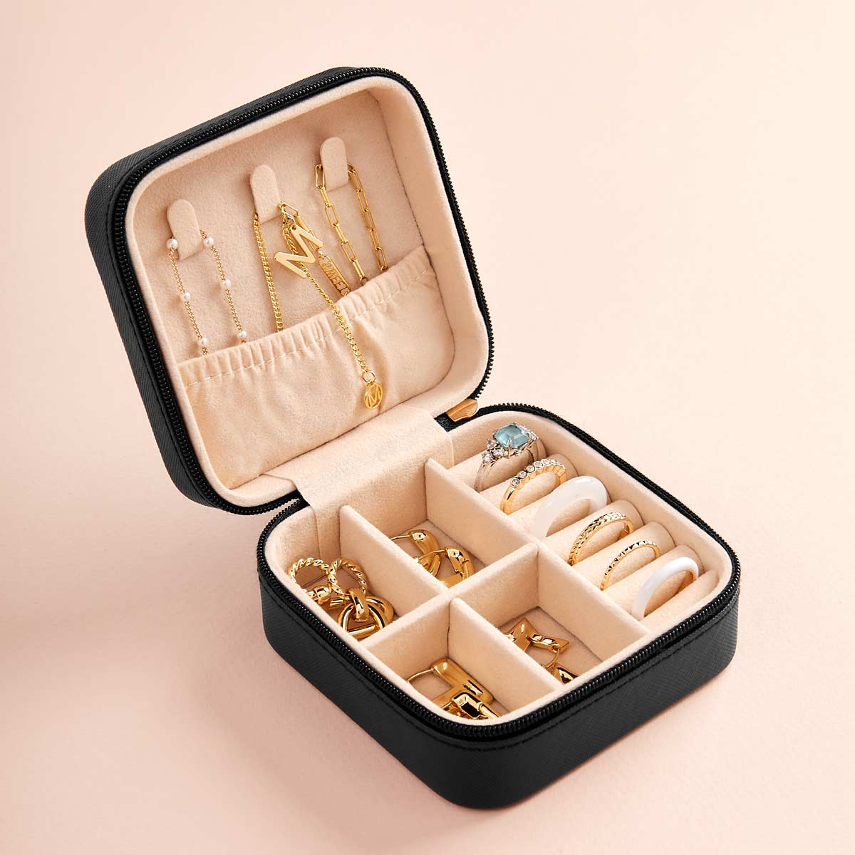 Alhajero con compartimento principal con cierre. Interior tipo terciopelo que protege la joyería de rayones y daños. Incluye 3 ganchos para collares, 6 ranuras para anillos, 1 bolsillo interior con elástico y 4 divisiones.