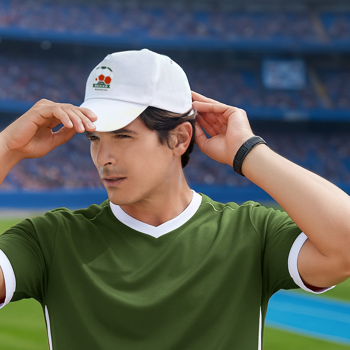 Gorra con broche de velcro ajustable. Botón forrado. 5 gajos. Ojillos bordados. Cómoda e ideal para protegerse del sol.