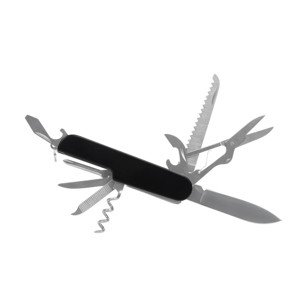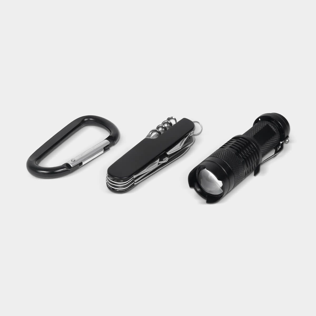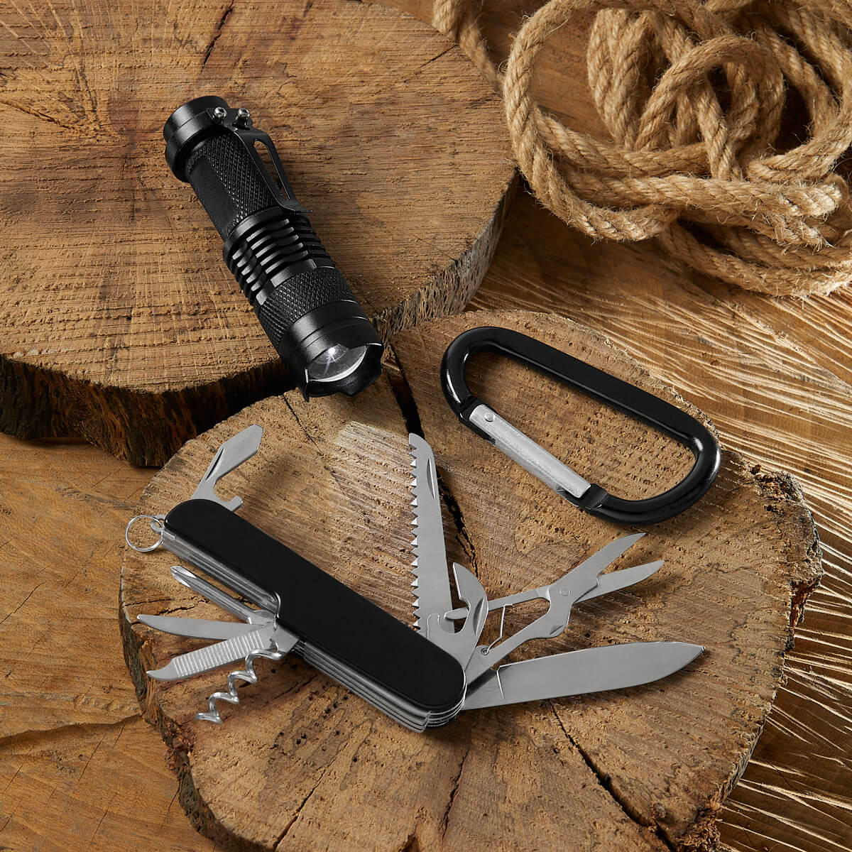Set de herramientas multiusos. Incluye gancho metálico, lámpara con luz ajustable y navaja con 9 funciones: (navaja, sierra, tijeras, destapador, abrelatas, sacacorchos, guía de hilo, lima y desarmador de cruz). Incluye caja individual.